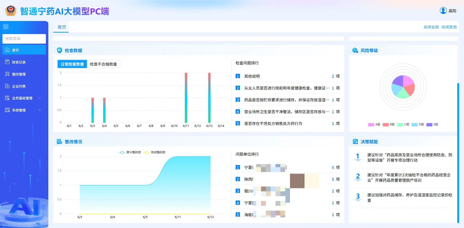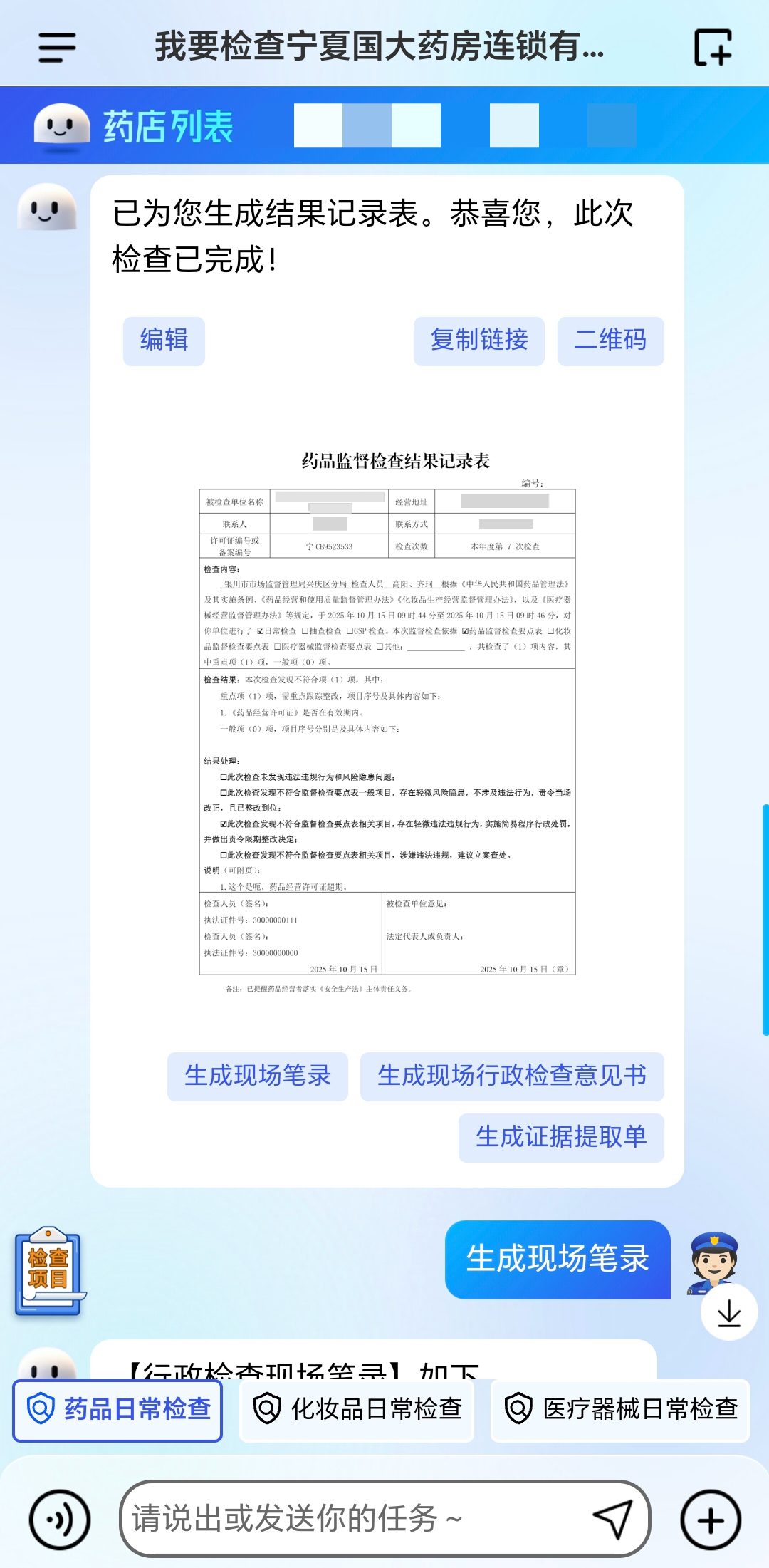 准确定位,助力基层监管“减负增效”。聚焦基层“两品一械”日常监管“任务重、人员少、专业弱”的核心痛点,系统以智能化手段将原本需要2小时的检查流程压缩至30分钟内通过对话完成,大幅缩短单次检查时间。系统内嵌法规知识库,为经验不足的人员实时提供法规依据与操作指引,实现“系统懂法、实时辅助”。系统研发采用“自下而上”建设思路,在银川市兴庆区、西夏区、贺兰县,石嘴山市大武口区和中卫市中宁县等市县开展试点,结合一线反馈持续优化功能,达成“技术兜底、人机协同”的目的,真正让智能监管工具实现了“好用、爱用、主动用”的效果,切实为基层解决了“人少、事多、专业力量不足”的现实困扰。